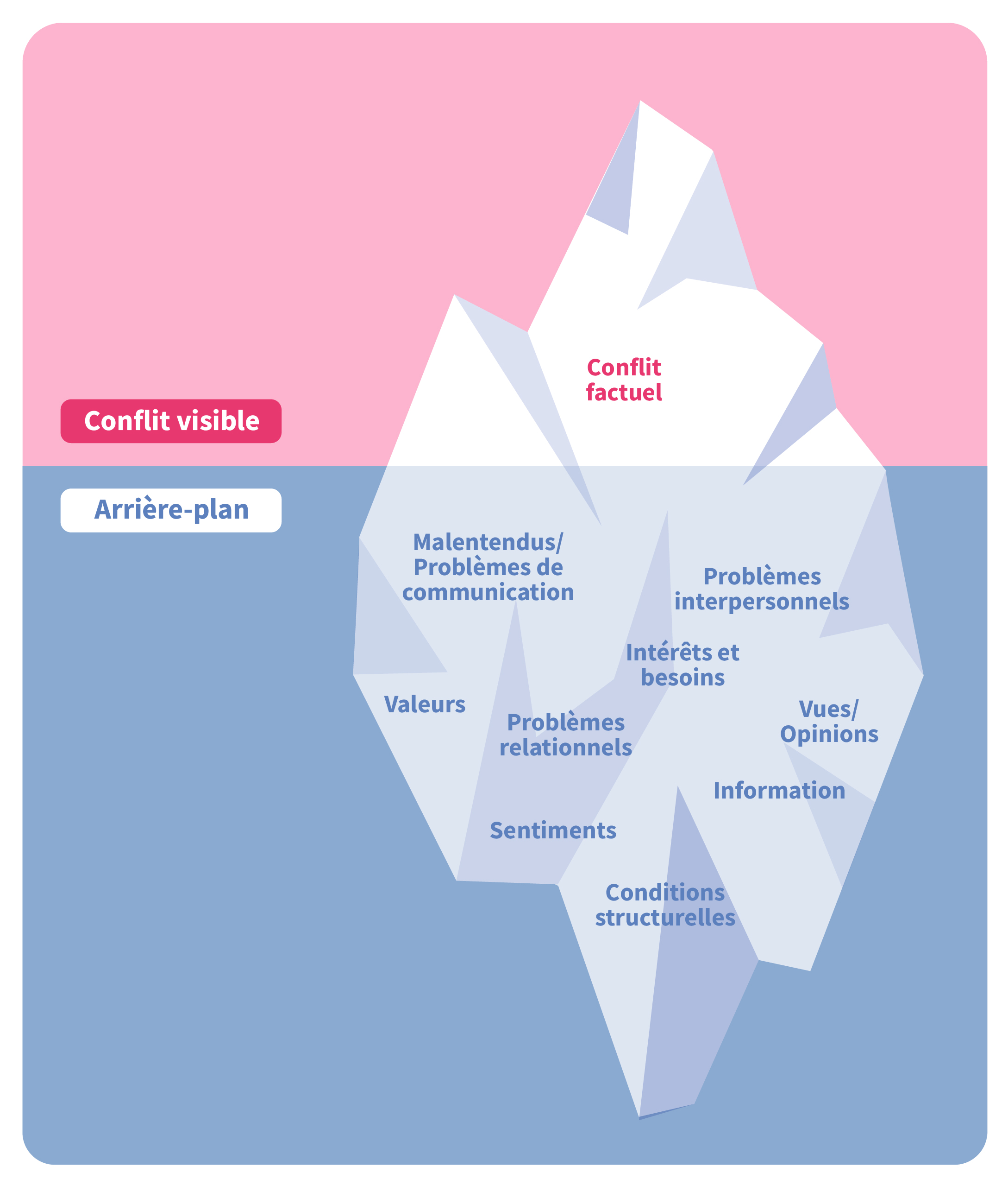 Tout désaccord a une cause profonde, un point unique de divergence d’opinion. Les conflits naissent au niveau factuel et sont souvent alimentés par des motivations diverses, notamment des intérêts, des émotions, des valeurs et des points de vue. De plus, des sentiments intrinsèques, comme le malaise ressenti sur le moment, influencent considérablement les réactions et les comportements des parties en conflit. Cette dynamique est représentée visuellement par une pyramide, illustrant qu’il existe toujours une couche superficielle visible du conflit masquant divers facteurs sous-jacents invisibles.