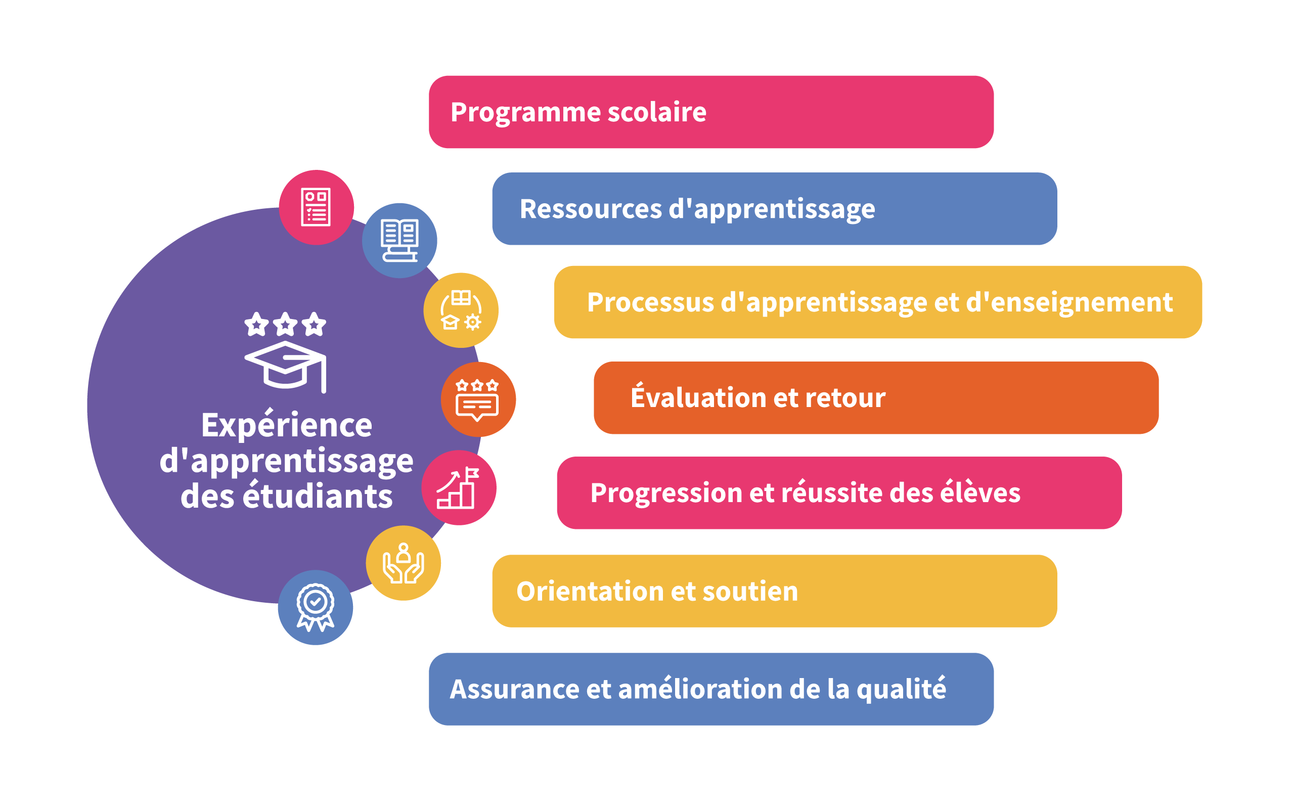 L’engagement des apprenants nécessite une approche structurée qui les accompagne dans tous les domaines pertinents pour leur expérience d’apprentissage. Cela signifie que l’engagement des apprenants ne doit pas se limiter aux domaines où leur expérience est la plus visible – comme les ressources pédagogiques et le processus d’apprentissage et d’enseignement – mais aussi à des sujets tout aussi importants pour eux, comme l’évaluation, l’orientation et l’assurance qualité. La figure ci-dessous présente les domaines clés pertinents pour l’expérience d’apprentissage des étudiants et, par conséquent, pour un engagement efficace des apprenants.